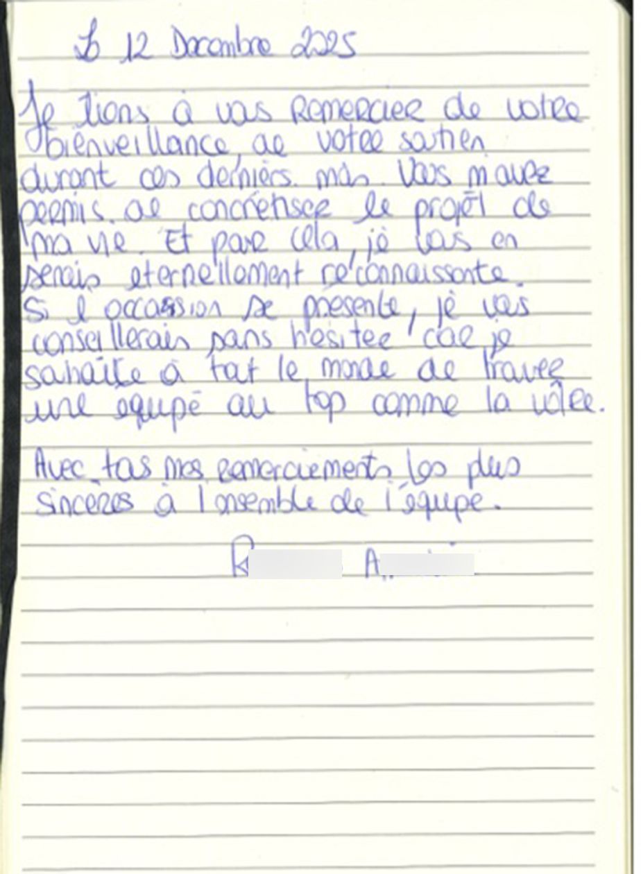 Je tiens à vous remercier de votre bienveillance, de votre soutien durant ces derniers mois. Vous m’avez permis de concrétiser le projet de ma vie. Et pour cela, je vous en serai éternellement reconnaissante. Si l’occasion se présente, je vous conseillerai sans hésiter car je souhaite à tout le monde de trouver une équipe au top comme la vôtre.