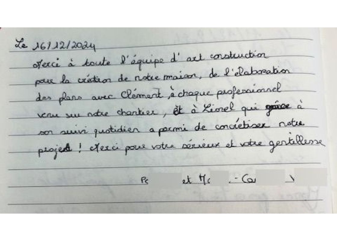 Merci à toute l’équipe d’Art Construction pour la création de notre maison ; de l’élaboration des plans avec Clément, à chaque professionnel venu sur notre chantier et à Lionel qui grâce à son suivi quotidien a permis de concrétiser notre projet ! Merci pour votre sérieux et votre gentillesse.