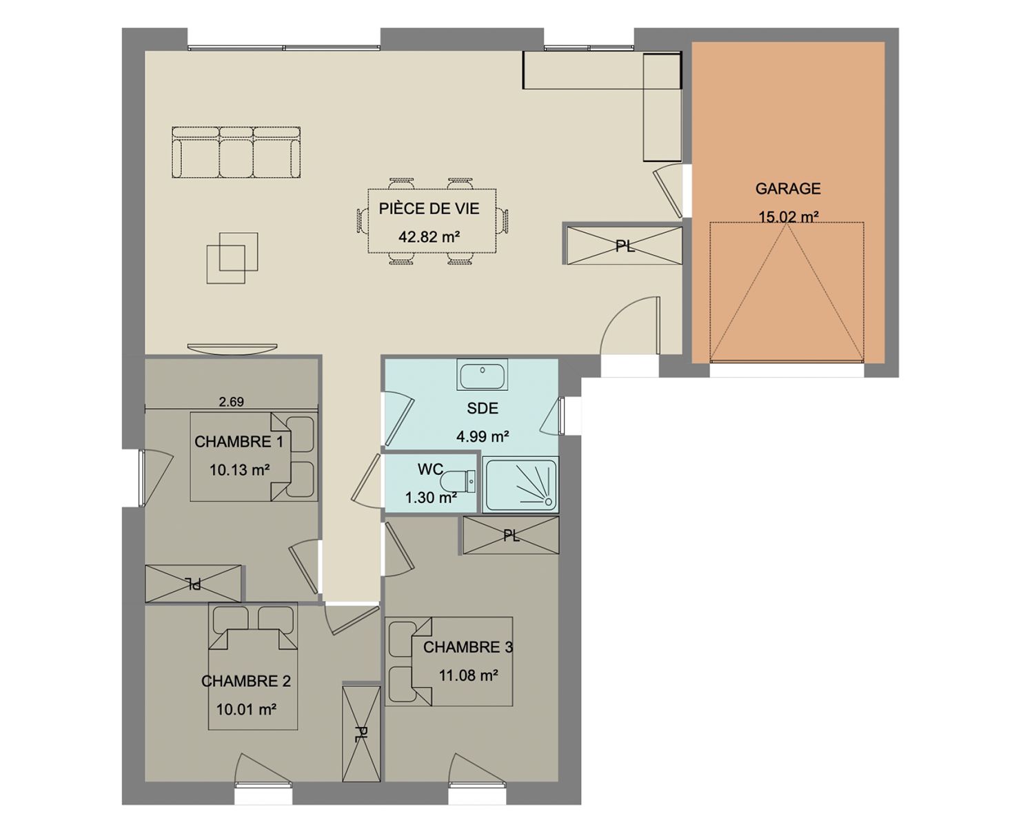Ce plain-pied en « L », simple et bien organisé comprend, en partie nuit, 3 belles chambres avec placards, un bureau de 9 m² et une salle de bains avec une douche et une baignoire. Le coin séjour est très lumineux grâce à ses deux baies vitrées. Vous apprécierez aussi la cuisine ouverte sur la pièce de vie. Un garage vient compléter cette ensemble.