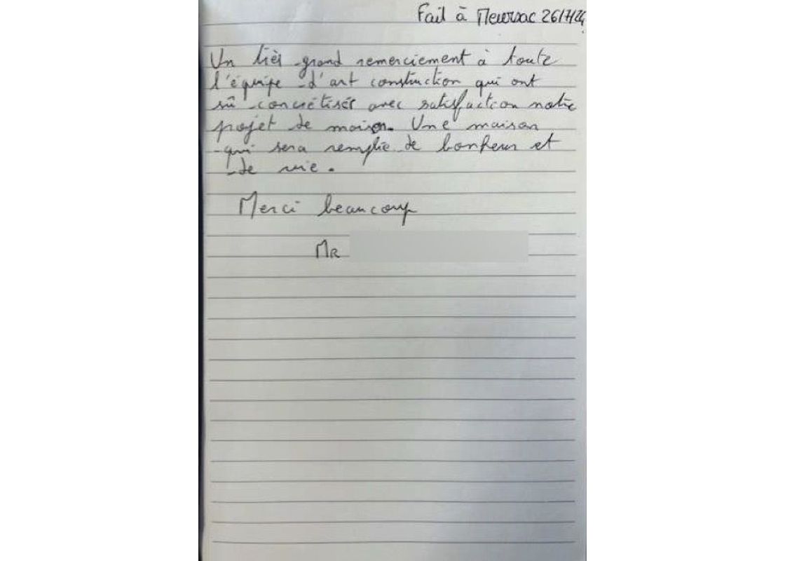 Un très grand remerciement à toute l’équipe d’Art Construction qui ont su concrétiser avec satisfaction notre projet de maison. Une maison qui sera remplie de bonheur et de vie.