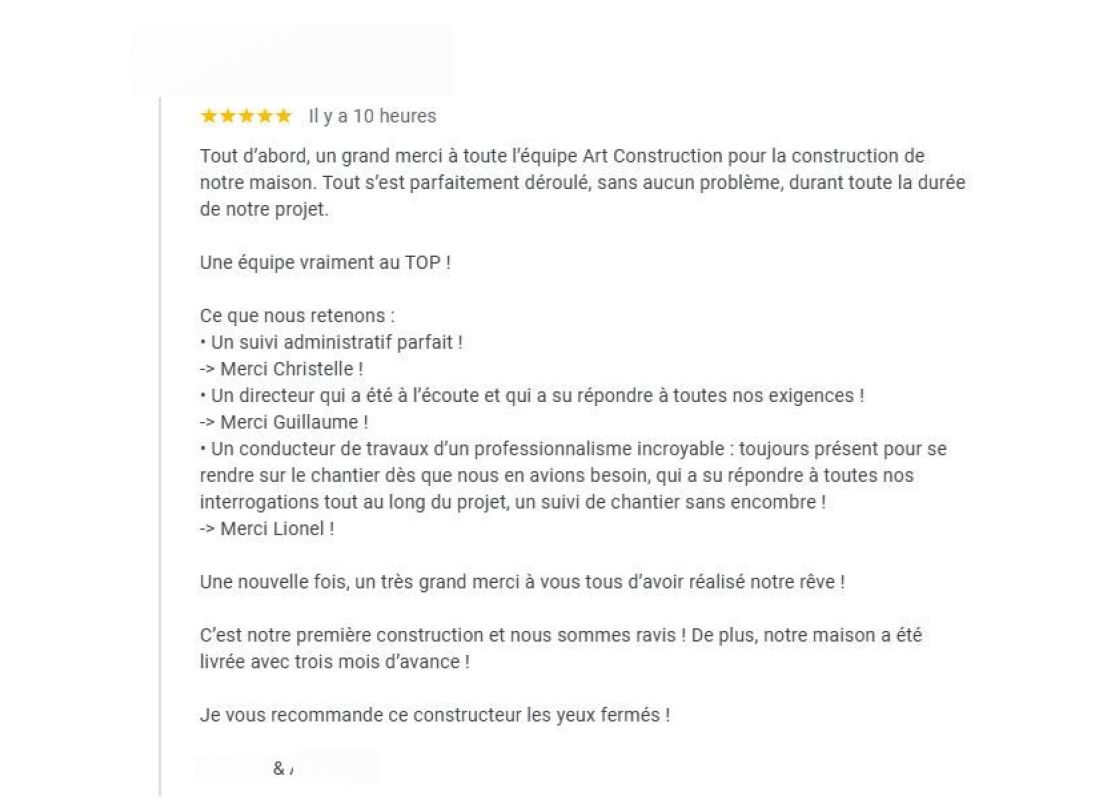 Tout d’abord un grand merci à toute l’équipe Art Construction pour la construction de notre maison. Tout s’est parfaitement déroulé, sans aucun problème, durant toute la durée de notre projet.