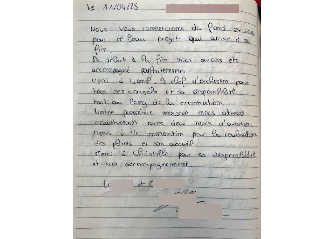 Nous vous remercions du fond du cœur pour ce beau projet qui arrive à sa fin. Du début à la fin nous avons été accompagnés parfaitement. Merci à Lionel le chef d’orchestre pour tous ses conseils et sa disponibilité tout au long de la construction. Notre première maison nous attend maintenant avec 2 mois d’avance. Merci à M F. pour la réalisation des plans et son accueil. Merci à Christelle pour sa disponibilité et son accompagnement.