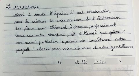 Merci à toute l’équipe d’Art Construction pour la création de notre maison ; de l’élaboration des plans avec Clément, à chaque professionnel venu sur notre chantier et à Lionel qui grâce à son suivi quotidien a permis de concrétiser notre projet ! Merci pour votre sérieux et votre gentillesse.