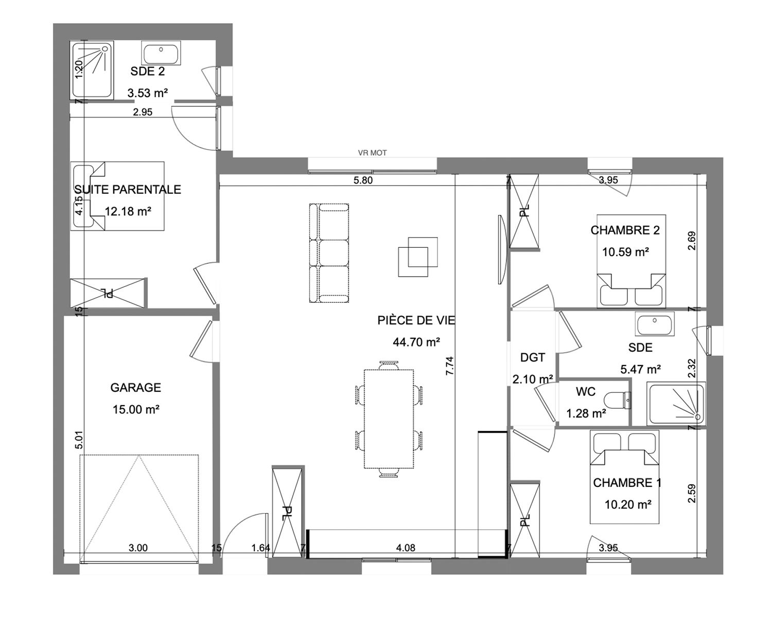Cette maison de plain-pied est composée d’un séjour avec cuisine ouverte et d’une partie « nuit » avec trois chambres et une salle de bain. Un garage vient compléter cet ensemble.