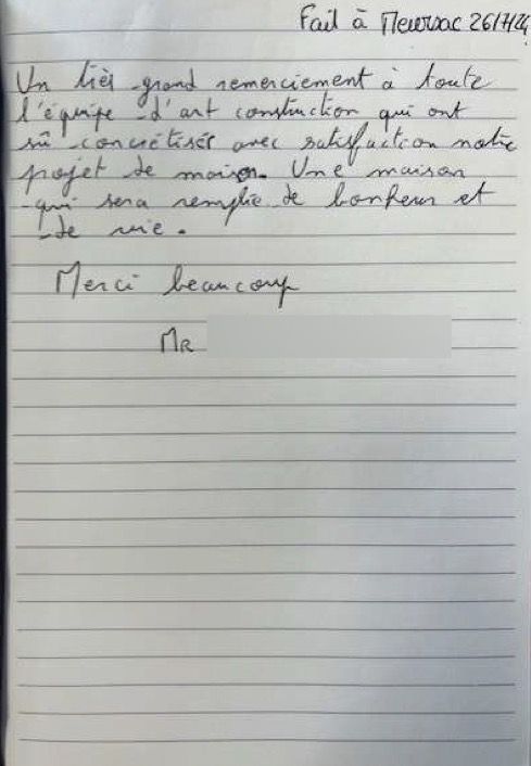 Un très grand remerciement à toute l’équipe d’Art Construction qui ont su concrétiser avec satisfaction notre projet de maison. Une maison qui sera remplie de bonheur et de vie.